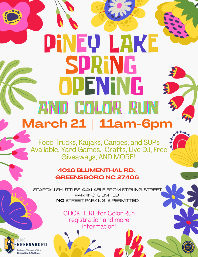 Spartan Chariots will be available all day to bring students from campus to Piney Lake! Parking is limited and street parking is not permitted,use of Spartan Chariots is recommended for guaranteed entry to Piney Lake!